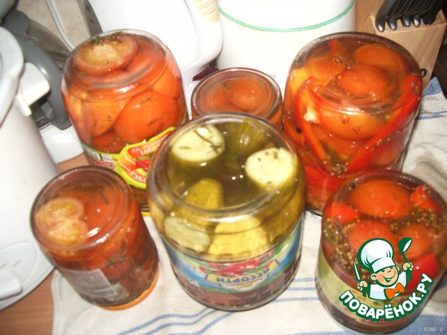 Ну и сам результат. Через 4-5 дней всё готово - помидоры, ассорти с огурцами, с болгарским перцем и т.д.