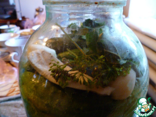 Итак начнем. Сначала нужно тщательно вымыть огурцы и простерилизовать бутыль с крышкой ( я делаю это в пароварке). Затем огурцы утрамбовываем как можно плотнее в подготовленный бутыль по плечики. Заливаем огурцы кипятком 2 раза на 20 минут и каждый раз нам понадобится свежая вода. Пока огурцы отпариваются, нужно приготовить листья, укроп, хрен. Все очистить и помыть. Затем воду с огурцов вылить, добавляем перец, чеснок, укладываем листья и укроп, хрен, сверху высыпаем полную стопку соли, неполную на 1 палец ( 85 г) стопку сахара и неполную на 2 пальца ( 75-65 г) стопку уксуса. Заливаем свежим кипятком, закатываем и переворачиваем верх дном до полного остывания. Затем выносим в погреб. Вот и весь секрет этих вкуснейших огурчиков.