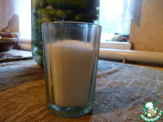 И неполную на 2 пальца ( 75-65 г) стопку уксуса. Яблочного или столового. Раньше я закрывала со столовым уксусом, но пару раз мне попалась подделка и я испортила все огурцы. С тех пор не рискую и закрываю с яблочным.
