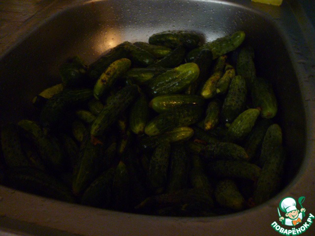 Сначала нужно тщательно вымыть огурцы. У меня прямо с грядки, я высыпала их в раковину, а она в углу, поэтому такое качество фото.