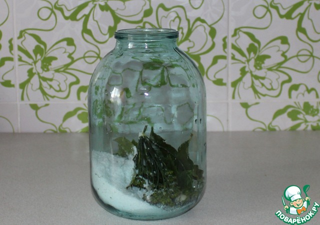 В 3-литровую банку всыпаем соль, добавляем всю зелень, чеснок...