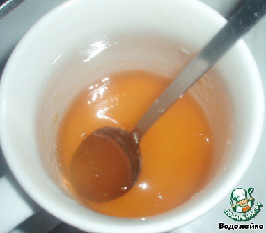 Пока маринад закипает, развести желатин где-то в 100 мл кипятка. И когда маринад закипит, влить желатин, хорошо перемешать и выключить плиту.