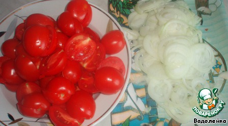 Теперь укладываем помидоры и лук слоями. Верхний слой лук.