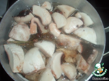 Положить в кастрюлю, залить подсоленной водой, довести до кипения, добавить уксус, растительное масло, гвоздику и все виды перца, лавровый лист, мелко нарубленный укроп и мускатный орех.