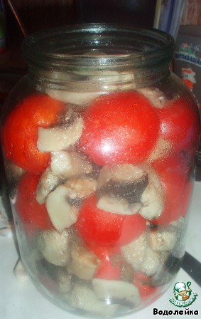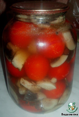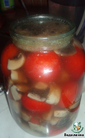 Затем маринад снова сливаем в кастрюлю, доводим его еще раз до кипения, заливаем наши помидоры с грибами и закатываем крышкой.