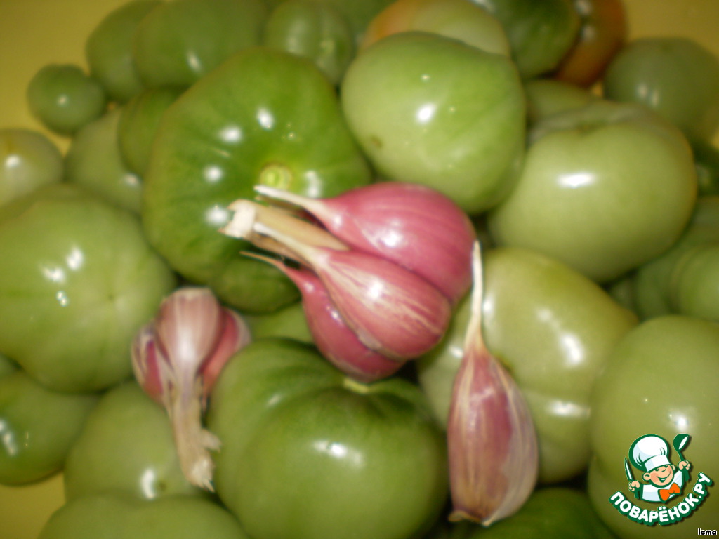 Зелёные помидоры, чеснок и листья чёрной смородины уложить в банки.
