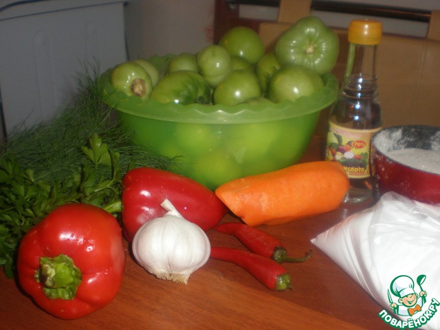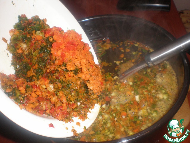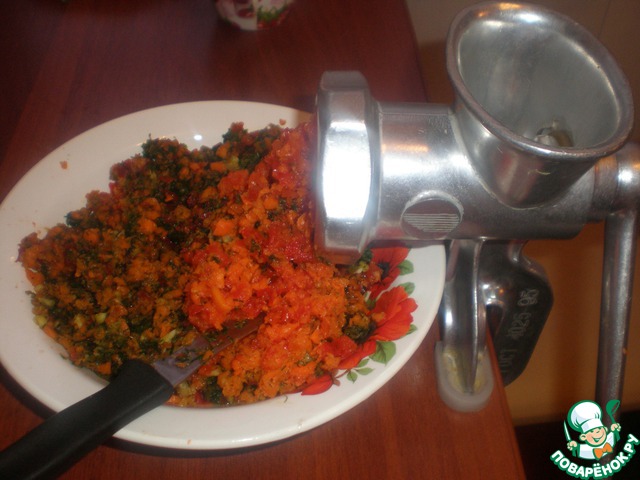 Перекручиваем перцы, моркoвь, чеснок, зелень.