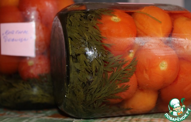 На дно банок уложить веточки моркови и затем помидоры. Заливаем первый раз кипящей водой и оставляем на 20-25 минут. Воду сливаем и варим маринад. Заливаем помидоры кипящим маринадом и закатываем. В банки кроме морковной ботвы, больше ничего не класть.!!!