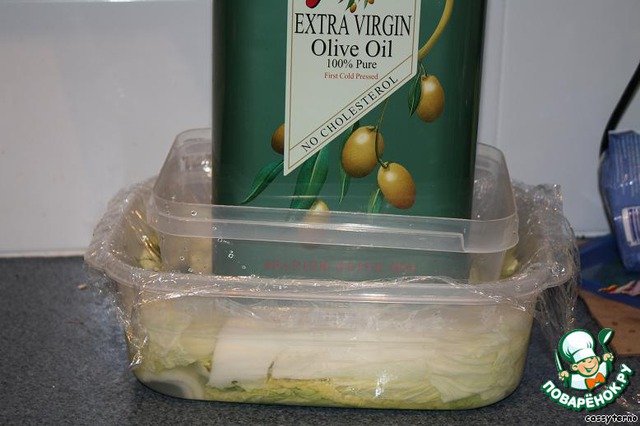 Теперь заливаем их нашим рассолом и придавливаем грузом. Мой покойный дед для таких целей хранил огромный булыжник. Мне он не достался к сожалению, поэтому приходится пользоваться чем ни попадя (в данном случае 4-х литровой бадьей оливкового масла (полной понятно). Нужно оставить все кваситься пару дней, поэтому нужно найти стратегическое место, куда это поставить. Запах сразу валит обалденный и нагоняющий аппетит - а это нежелательно для сохранения блюда (разойдется до того как поспеет). Поэтому если есть кладовка - это самое то что надо. У меня - нет, поэтому ставлю к стиральной машине. Ну это впрочем уже не рецепт, а личные жалобы по поводу жилищных условий, так что можно опустить.