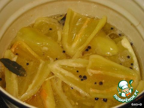 В удобной глубокой посуде с широкими краями вскипятить воду, добавить уксус, масло, чеснок, перец горшком, мед, соль, лавровый лист, растительное масло, перемешать, когда маринад закипит, опустить порциями перец, утопить его, чтобы он был полностью в жидкости, после закипания варить на среднем огне 10 минут, пока перец не станет мягким, но не переварите.