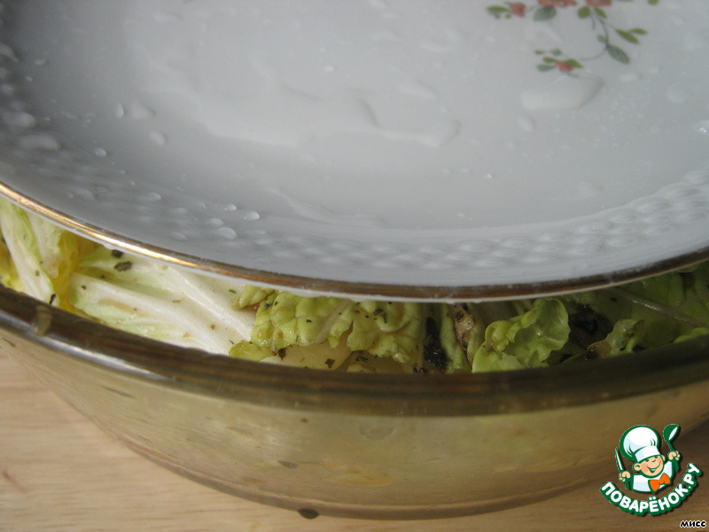 Сверху кладём тарелку, на неё груз, я взяла, что потяжелее нашлось в холодильнике - литровая бутылка с кефиром.