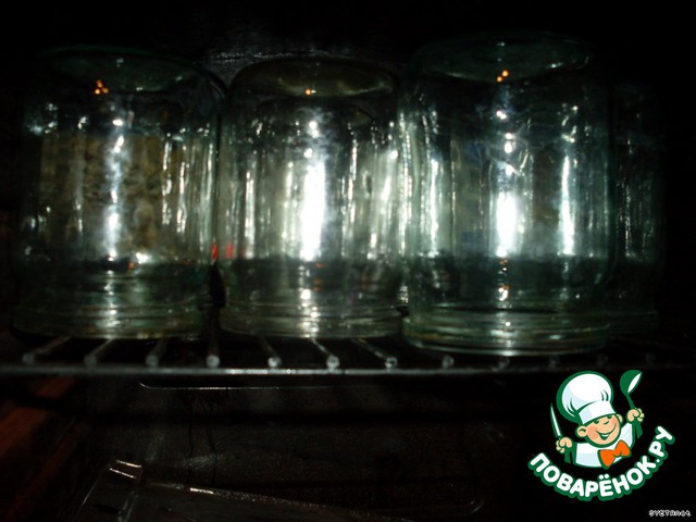 Банки (0,5 л) вымыть и простерилизовать. Удобнее всего это сделать в духовке, перевернув их вверх дном на решётке. Включите духовку на 5-7 минут и все банки сухие, стерильные и горячие.