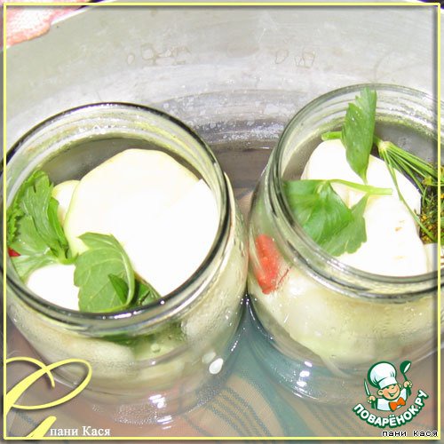 Поскольку я никогда точно не знаю, сколько банок получится, то мою их с запасом. В банки - зелень, по кусочку красного перца, перец горошек, пару-тройку зубков чеснока. Мытые мелкие патиссоны или кусками те, что покрупнее. Кипячу много воды, заливаю банки. Жду, пока подстынет.