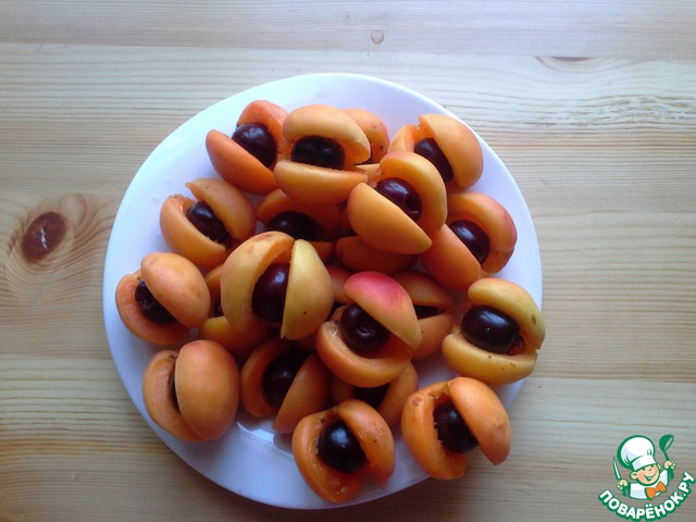 Рецепт на 1,5 л. банку. Абрикосы и вишню помыть. Абрикосы надрезать вдоль не до конца и удалить косточку. Получаются как бы раковинки со створками. У вишни удалить косточки.