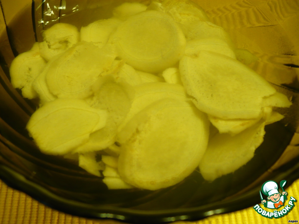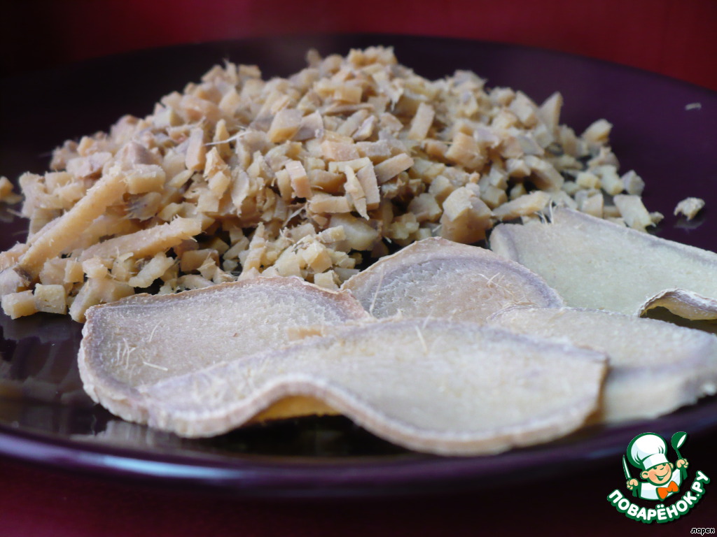 Нарезать корень на тонкие пластины и промыть несколько раз водой.