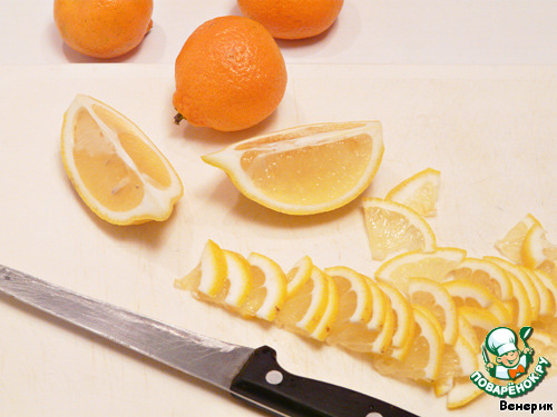 Мандарины помыть под проточной водой, обсушить. Разрезать на 4 части, и каждую часть нарезать на тонкие ломтики.
