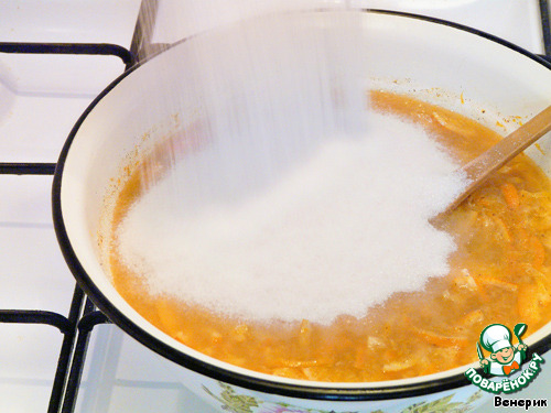 Снять с огня, добавить сахар, перемешать пока не растворится. Поставить на газ, дать закипеть и варить на медленном огне, помешивая, 1 час 20 минут.