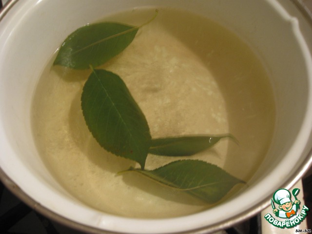 В кастрюльку наливаем воду для бланшировки и кладем 2-3 листика вишни (для сохранения цвета)
