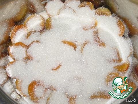 Теперь на дно варочной посуды (она должна быть с широкими и низкими краями) выкладываем слой половинок абрикосов чашечками вверх, засыпаем сахаром чтобы все половинки были заполнены,затем снова слой абрикосов,опять засыпаем сахаром и так до конца.