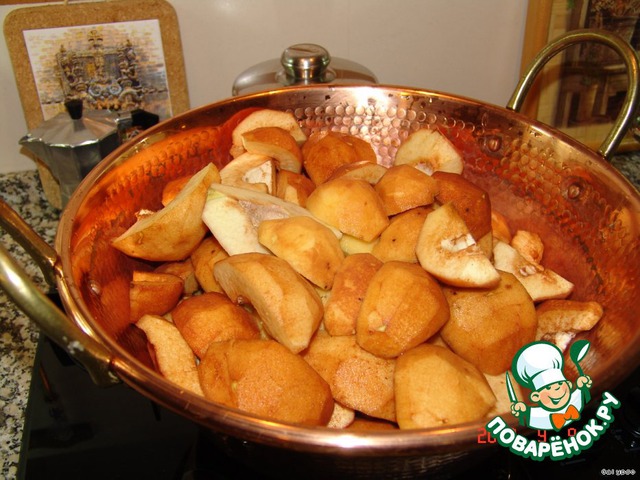 Освобожденную от кожуры айву разрезать на четвертинки или мельче, если айва очень большая. Удалить плодоножки и семечки.