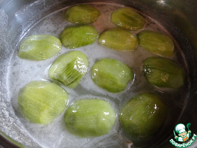 | В наших краях варенье делают немножко по-другому. Ярким примером может быть рецепт Ларисы ларек "Варенье из апельсиновых корочек". Используются не только апельсиновые корочки, но и корочки грейпфрута, лимона, бергамота, дикого апельсина, арбуза и многих других фруктов. Также варенье делают из маленьких целых плодов дикого апельсина, инжира, черешни, грецкого ореха, миндаля, фисташков, грибов, баклажанчиков, морковочки, огурцов, лепестков чайной розы... Список можно продолжать еще долго. Для многих видов варенья используется известковая вода, которая делается на основе негашеной извести. Делается это для того, чтобы фрукт не терял своей формы и был более крепким. Но, есть много фруктов, которые не требуют вымачивания в известковой воде. Именно такой вариант я и хочу вам представить. Подают такую сладость на маленькой тарелочке со стаканом ледяной воды. |