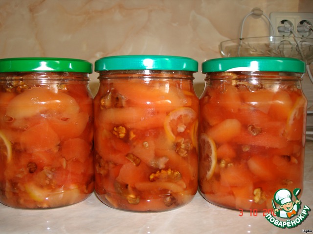 Снятую кожуру залить 1 стаканом воды, варить 10-15 минут. Процедить и отставить, а добавить в варенье перед последней варкой, вместе с грецкими орехами.