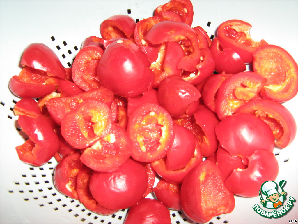 Острый красный перец тоже моем, очищаем от семян и перегородок.