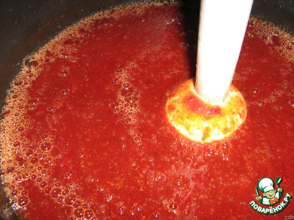 Нарезанный перец помещаем в кастрюлю, добавляем красное сухое вино, сахар, соль. Варим 1,5 часа на медленном огне