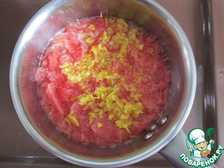 Засыпать в кастрюльку мякоть грейпфрутов, цедру и сок лимона, всыпать сахар (по весу - половина веса мякоти грейпфрута).