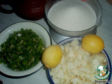 Итак, первым делом чистим и режим киви (я резала кубиками), яблоки ( я порезала так же кубиками, потому что хотела, что бы были кусочки яблок). Яблоки можно потереть на терку или измельчить в блендере(тогда конфитюр будет более однородный).Из двух лимонов выдавить сок.