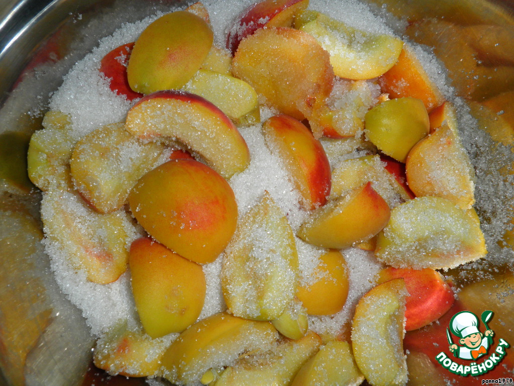 Персики надо очистить от кожицы и нарезать на дольки. Сразу скажу, я от кожуры не очищала, просто хорошо потерла, чтобы не было ворсинок. И лучше всего брать очень спелые и мягкие - больше сока будет. Засыпать дольки сахаром и дать постоять 1 час.