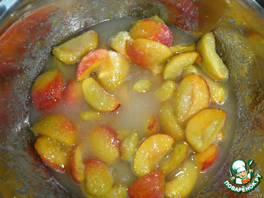 Через час, когда персики пустят сок, поставить их на огонь. У меня стояли, наверное, все 3 часа, а сока все равно было немного, и сахар практически не растворился (очень уж твердые персики попались). Поэтому пришлось влить еще 50 мл воды.