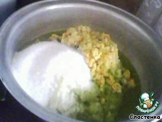 Добавляем к перекрученным кабачкам лимоны и апельсины и высыпаем туда же сахар. Оставляем до растворения сахара.