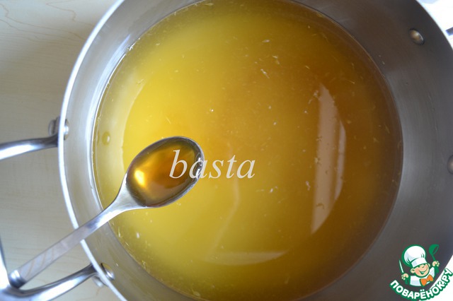 Сполоснуть ту же самую кастрюлю и заложить все составляющие для сиропа:сахар, мёд, сок 2 апельсинов, воду.
