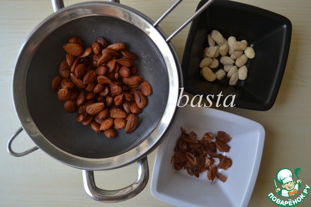 Тем временем залить миндаль (можно взять от 150 до 200 гр) горячей водой, оставить миндаль на минут 10.