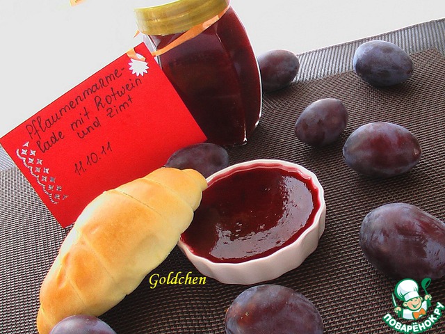 Сливы помыть, очистить от косточек и порезать на кусочки. Добавить ванильный и желейный сахар, перемешать и варить после кипения 4 минуты. Кастрюлю снять с плиты, добавить вино и корицу. В простерилизованные банки налить мармелад и закрыть крышкой. Поставить верх дном.