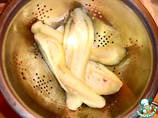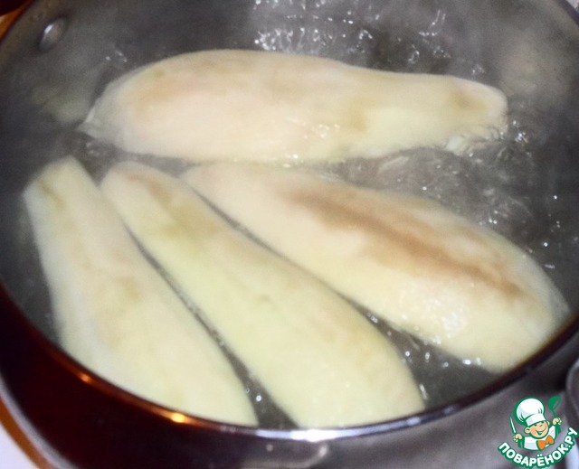 Для этого рецепта лучше использовать маленькие баклажаны (я таких не нашла и взяла на пробу 1 баклажан среднего размера). Баклажаны почистите, но хвостики оставьте (я разрезала баклажан вдоль на 4 части). Очищенные баклажаны положите в соленую воду на 20 минут. Затем промойте баклажаны под холодной водой и положите в кастрюлю с кипящей водой.
