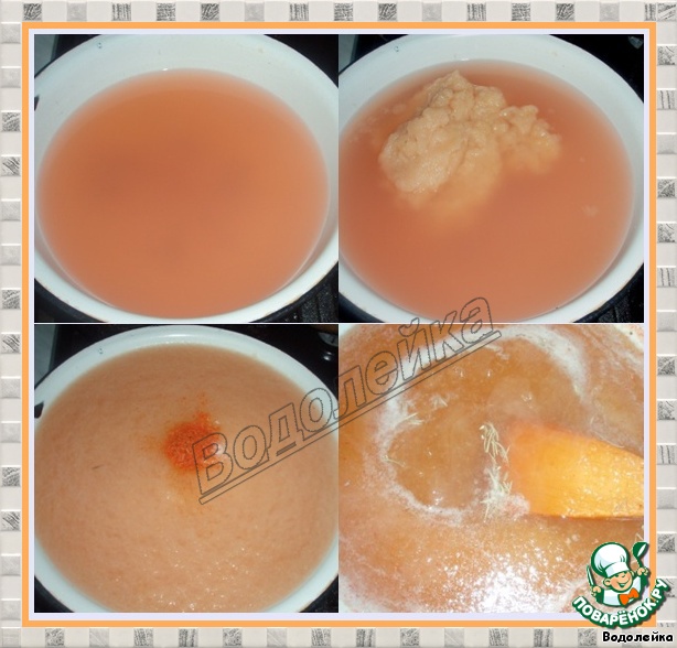 Дальше сок перелить в кастрюлю + сахар + шафран(у меня шафран не молотый, а вес его я измеряла на электронных весах) и варить 30 минут, постоянно помешивая.