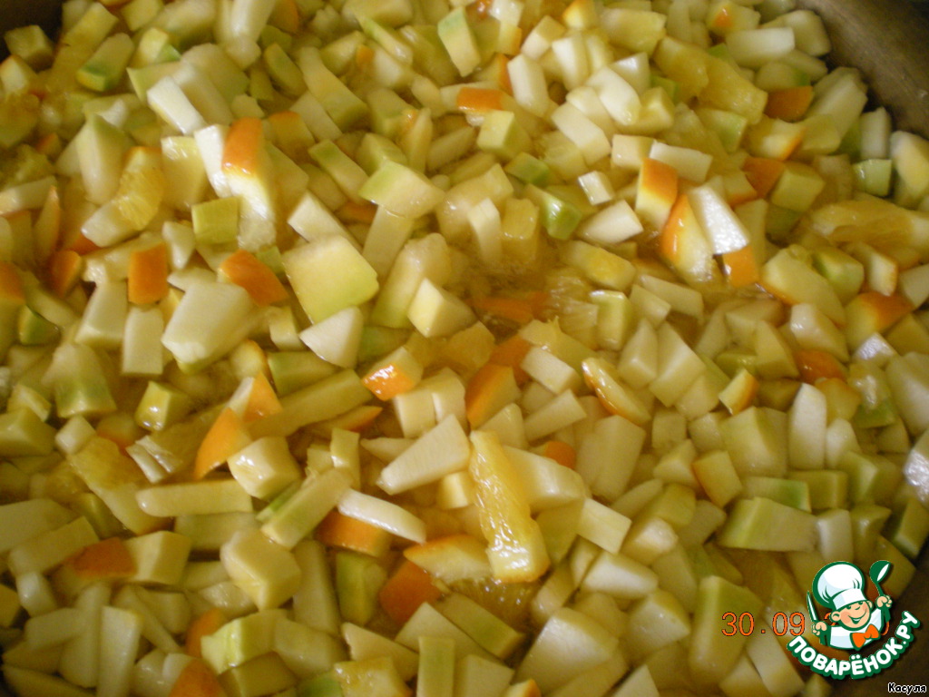 Кабачки и тыкву режем мелкими кубиками, так же режем и апельсины. Изюм залить кипятком минут на 5, чтобы немножко разбух и вышла вся грязь, промыть и добавить в общую массу.