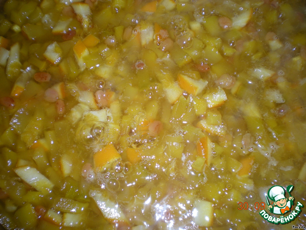 Сварить сироп (я взяла 2 стакана воды, но можно и меньше, быстрее сироп загустеет). Залить все сиропом и варить час-полтора. Вконце добавить 2 ч. л. лимонной кислоты. Закатать в банки. У меня получилось где-то 3 литра.