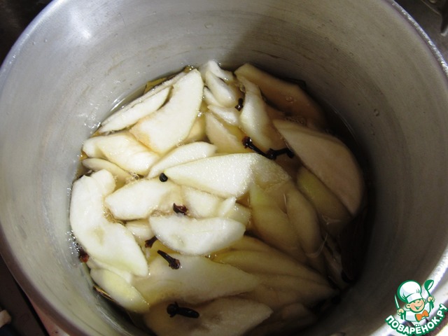 В кипящий сироп добавляем пряности и груши, делаем огонь маленьким и оставляем тихонечко кипеть на 30 минут без крышки.
