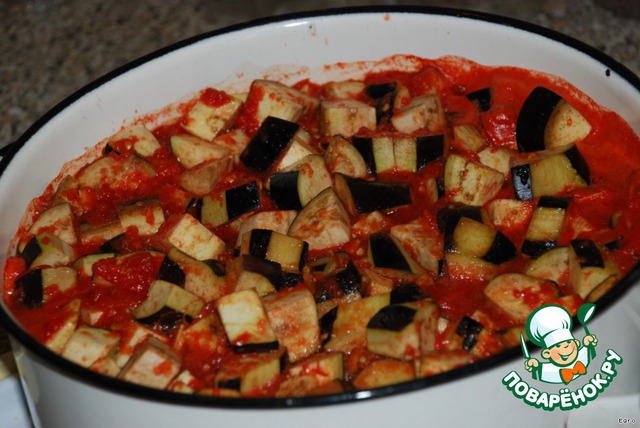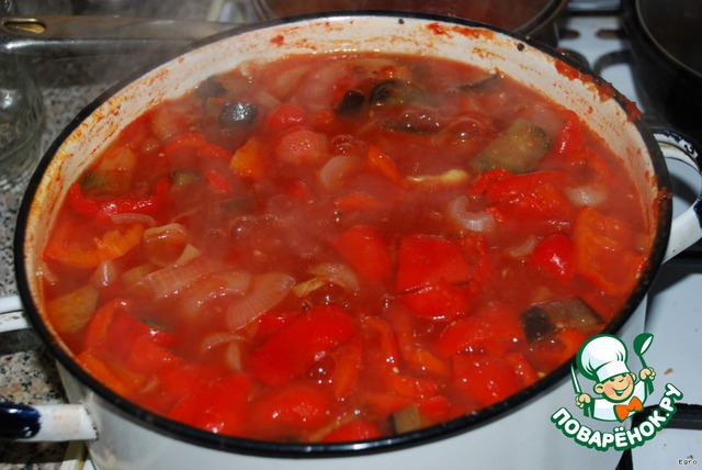 Когда томатный сок закипел засыпаем в него баклажаны и варим 10 минут на небольшом огне.