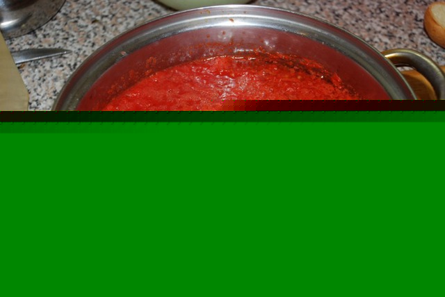 Помидоры перекручиваем в мясорубке так чтобы получился сок с мякотью. Наливаем в кастрюлю и ставим на огонь, добавляем соль, сахар, уксус.