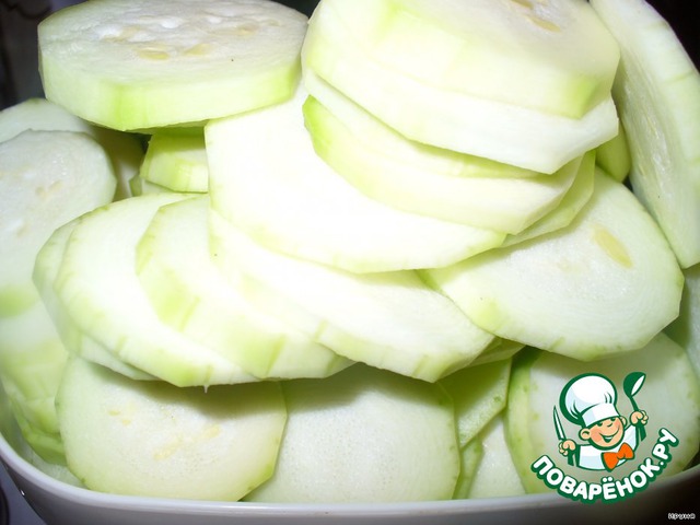 Молодые кабачки (т.е. можно и не молодые, но чем меньше кабачок, тем эффектнее получается салат, и отсутствуют семечки) очищаем от кожицы и режем тонкими кружочками.