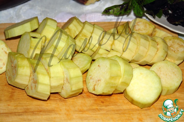 Я баклажаны очищаю, но это не обязательно. Нарезать баклажаны кружочками толщиной в 1 см.