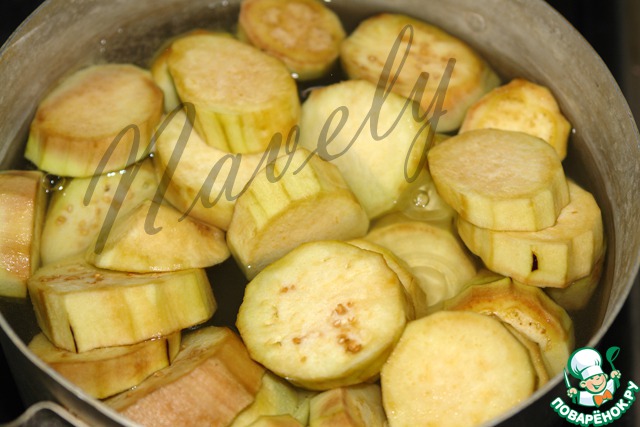 Воду довести до кипения, сильно посолить (примерно на 2 литра воды 2 полные ложки соли) и бланшируем баклажаны 3-4 минуты. Выкладываем их в дуршлаг, даем стечь воде.