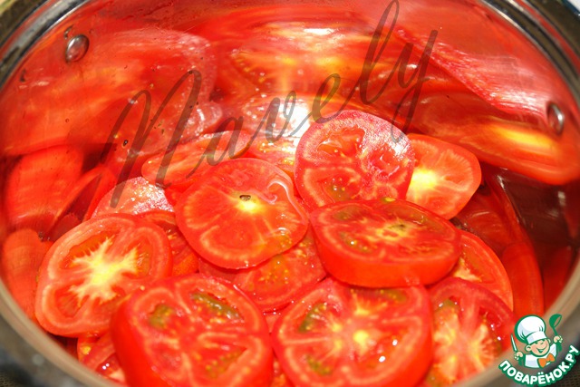 Помидоры нарезаем не тонкими кружочками и выкладываем их в кастрюлю.