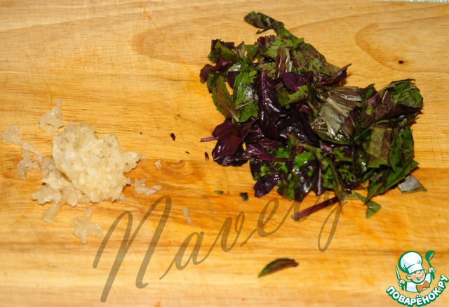 Тем временем режем не очень крупно базилик, чеснок пропускаем через пресс. Добавляем это в кастрюлю к баклажанам и провариваем все вместе 5-10 минут.