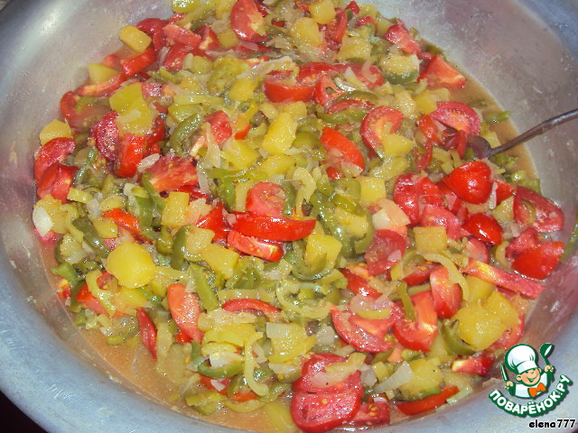 Лук и болгарский перец нарезать соломкой и по отдельности обжарить в растительном масле. Помидоры нарезать дольками.