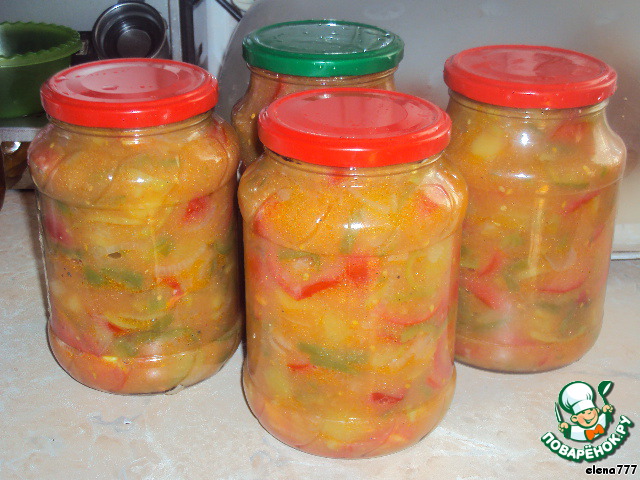 | Замечательный салат-ассорти на зиму с кабачками, сладким перцем и томатами. Салат вроде бы и простой, но очень вкусный. |